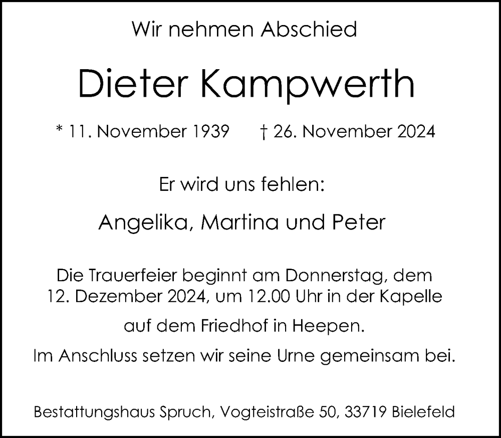 Hier finden Sie alle Traueranzeigen aus der Zeitung, die bisher für Dieter Kampwerth erschienen sind. Weitere Traueranzeigen, die in der Zeitung erscheinen, werden hier ebenfalls aufgelistet