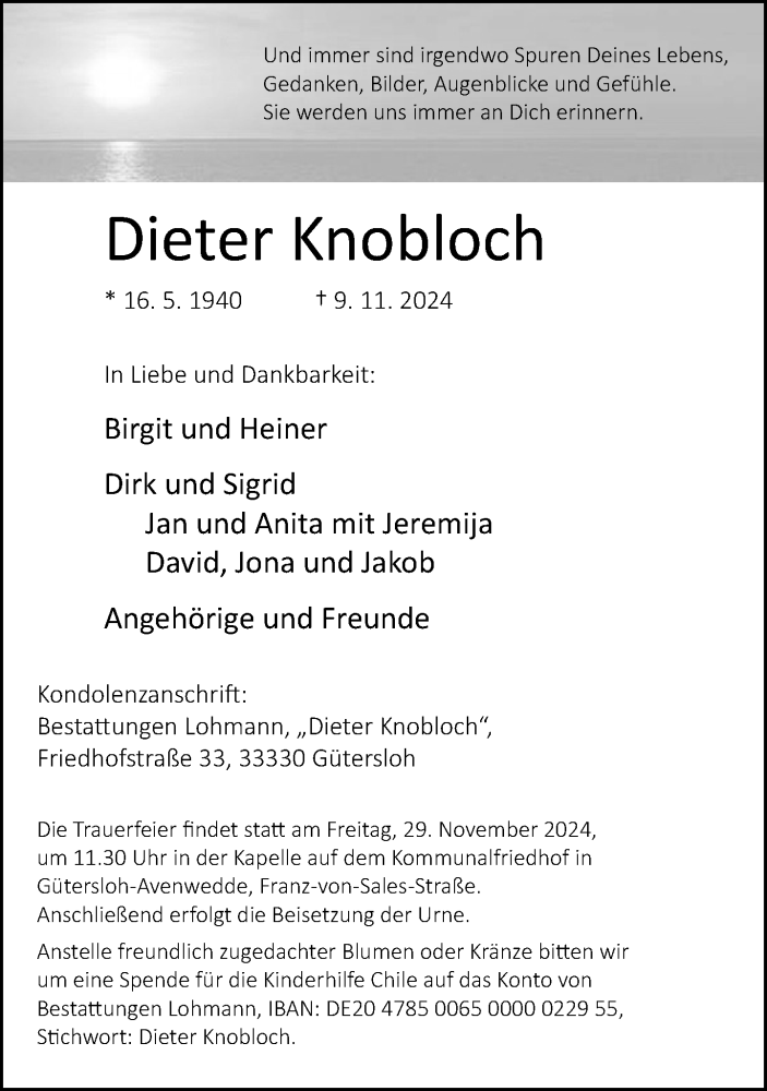 Hier finden Sie alle Traueranzeigen aus der Zeitung, die bisher für Dieter Knobloch erschienen sind. Weitere Traueranzeigen, die in der Zeitung erscheinen, werden hier ebenfalls aufgelistet