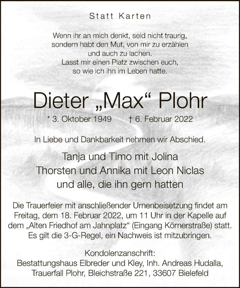 Hier finden Sie alle Traueranzeigen aus der Zeitung, die bisher für Dieter Plohr erschienen sind. Weitere Traueranzeigen, die in der Zeitung erscheinen, werden hier ebenfalls aufgelistet