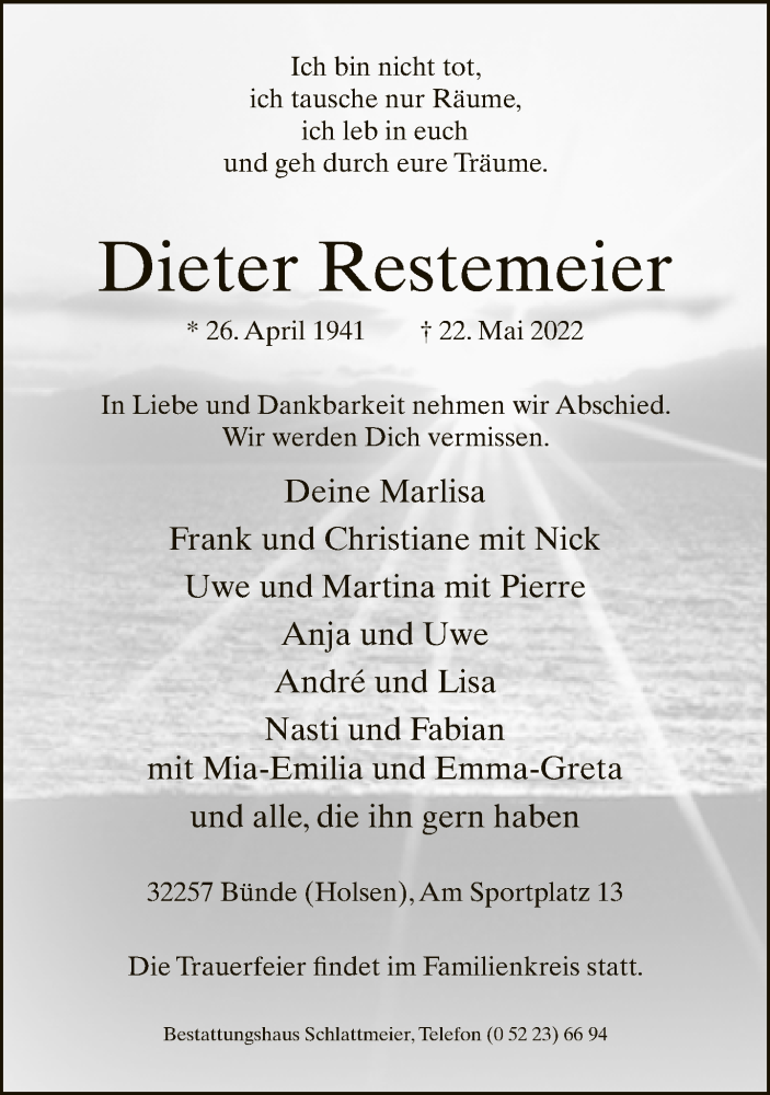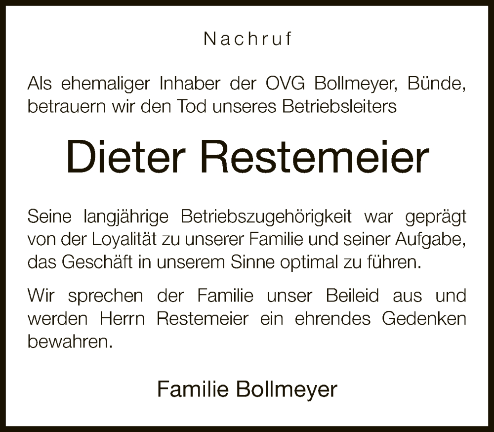 Hier finden Sie alle Traueranzeigen aus der Zeitung, die bisher für Dieter Restemeier erschienen sind. Weitere Traueranzeigen, die in der Zeitung erscheinen, werden hier ebenfalls aufgelistet