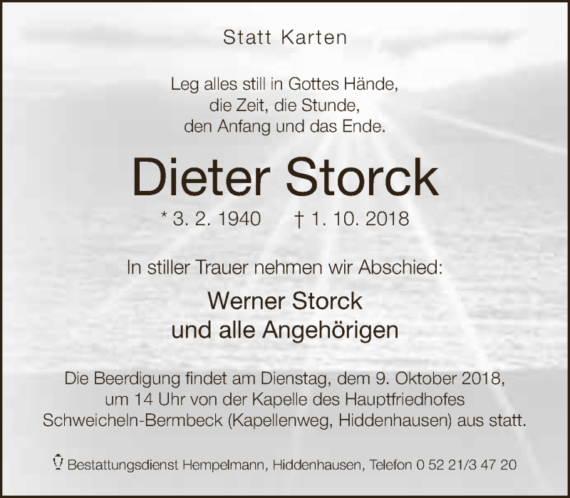 Hier finden Sie alle Traueranzeigen aus der Zeitung, die bisher für Dieter Storck erschienen sind. Weitere Traueranzeigen, die in der Zeitung erscheinen, werden hier ebenfalls aufgelistet