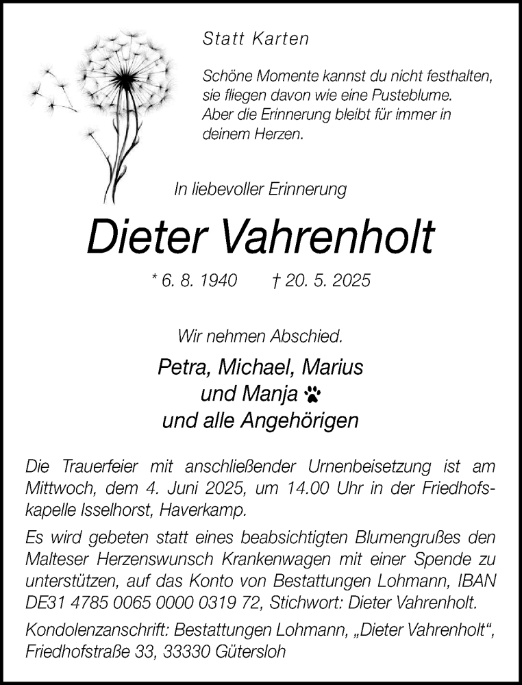 Hier finden Sie alle Traueranzeigen aus der Zeitung, die bisher für Dieter Vahrenholt erschienen sind. Weitere Traueranzeigen, die in der Zeitung erscheinen, werden hier ebenfalls aufgelistet