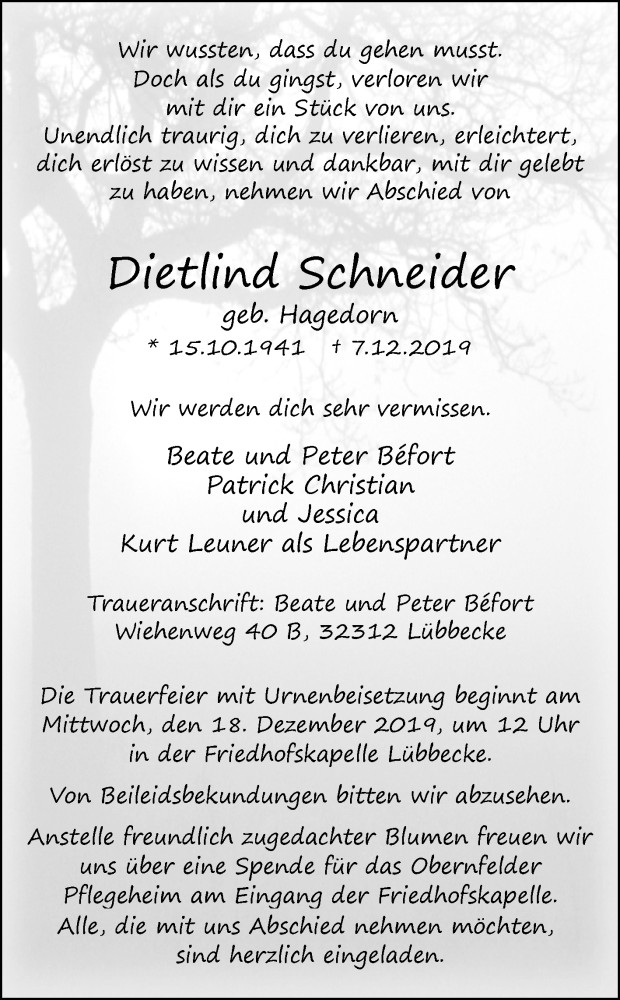 Hier finden Sie alle Traueranzeigen aus der Zeitung, die bisher für Dietlind Schneider erschienen sind. Weitere Traueranzeigen, die in der Zeitung erscheinen, werden hier ebenfalls aufgelistet