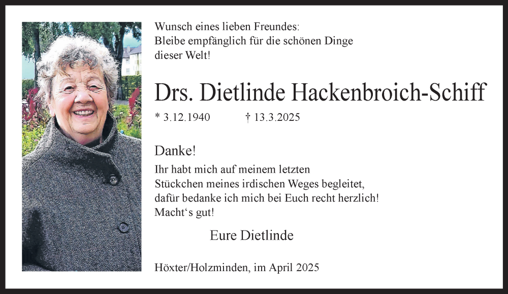 Hier finden Sie alle Traueranzeigen aus der Zeitung, die bisher für Dietlinde Hackenbroich-Schiff erschienen sind. Weitere Traueranzeigen, die in der Zeitung erscheinen, werden hier ebenfalls aufgelistet