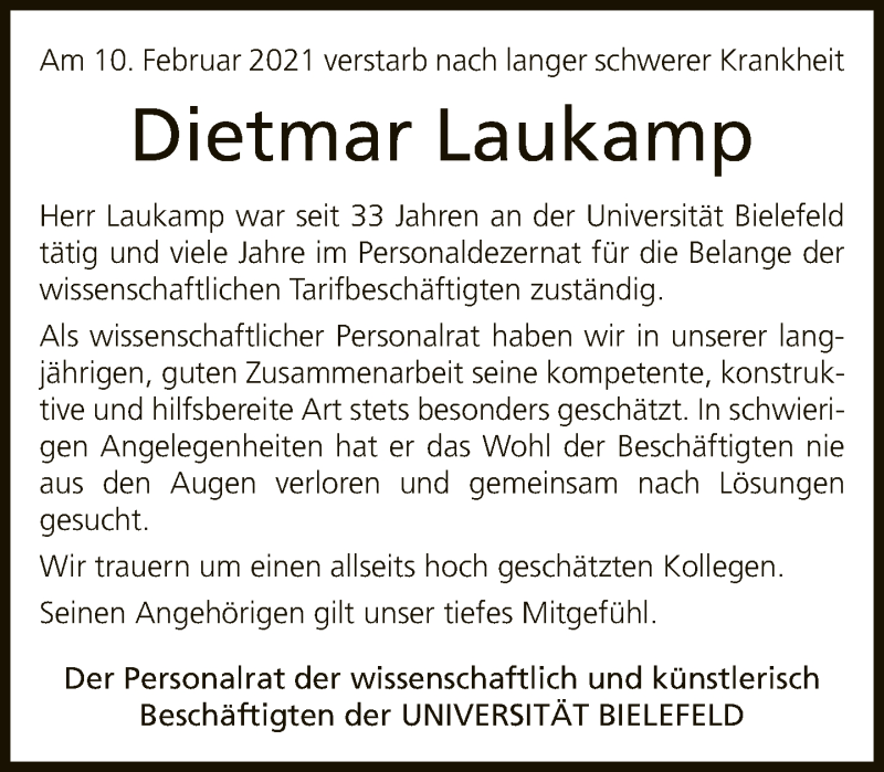 Hier finden Sie alle Traueranzeigen aus der Zeitung, die bisher für Dietmar Laukamp erschienen sind. Weitere Traueranzeigen, die in der Zeitung erscheinen, werden hier ebenfalls aufgelistet