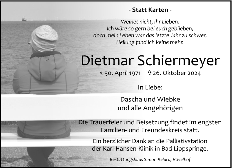 Hier finden Sie alle Traueranzeigen aus der Zeitung, die bisher für Dietmar Schiermeyer erschienen sind. Weitere Traueranzeigen, die in der Zeitung erscheinen, werden hier ebenfalls aufgelistet