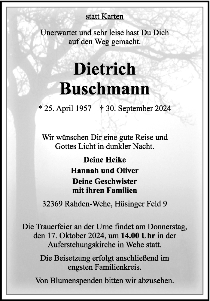 Hier finden Sie alle Traueranzeigen aus der Zeitung, die bisher für Dietrich Buschmann erschienen sind. Weitere Traueranzeigen, die in der Zeitung erscheinen, werden hier ebenfalls aufgelistet