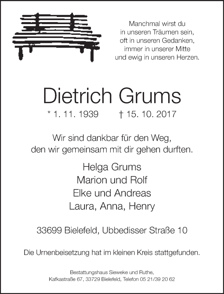 Hier finden Sie alle Traueranzeigen aus der Zeitung, die bisher für Dietrich Grums erschienen sind. Weitere Traueranzeigen, die in der Zeitung erscheinen, werden hier ebenfalls aufgelistet