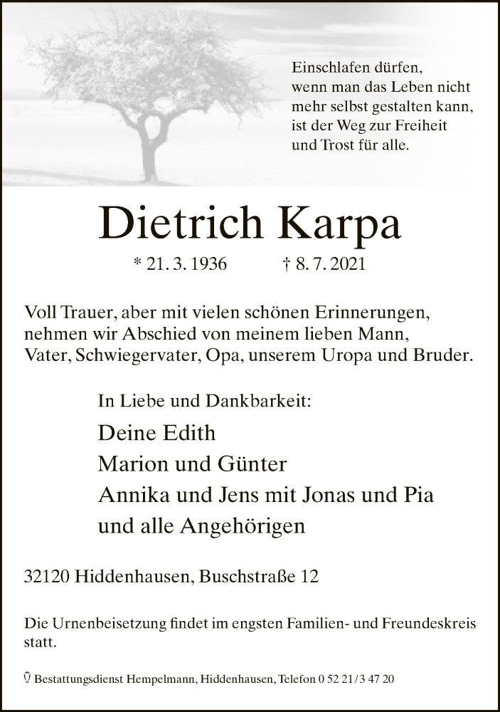 Hier finden Sie alle Traueranzeigen aus der Zeitung, die bisher für Dietrich Karpa erschienen sind. Weitere Traueranzeigen, die in der Zeitung erscheinen, werden hier ebenfalls aufgelistet