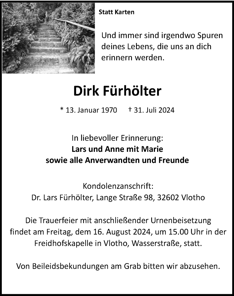 Hier finden Sie alle Traueranzeigen aus der Zeitung, die bisher für Dirk Fürhölter erschienen sind. Weitere Traueranzeigen, die in der Zeitung erscheinen, werden hier ebenfalls aufgelistet
