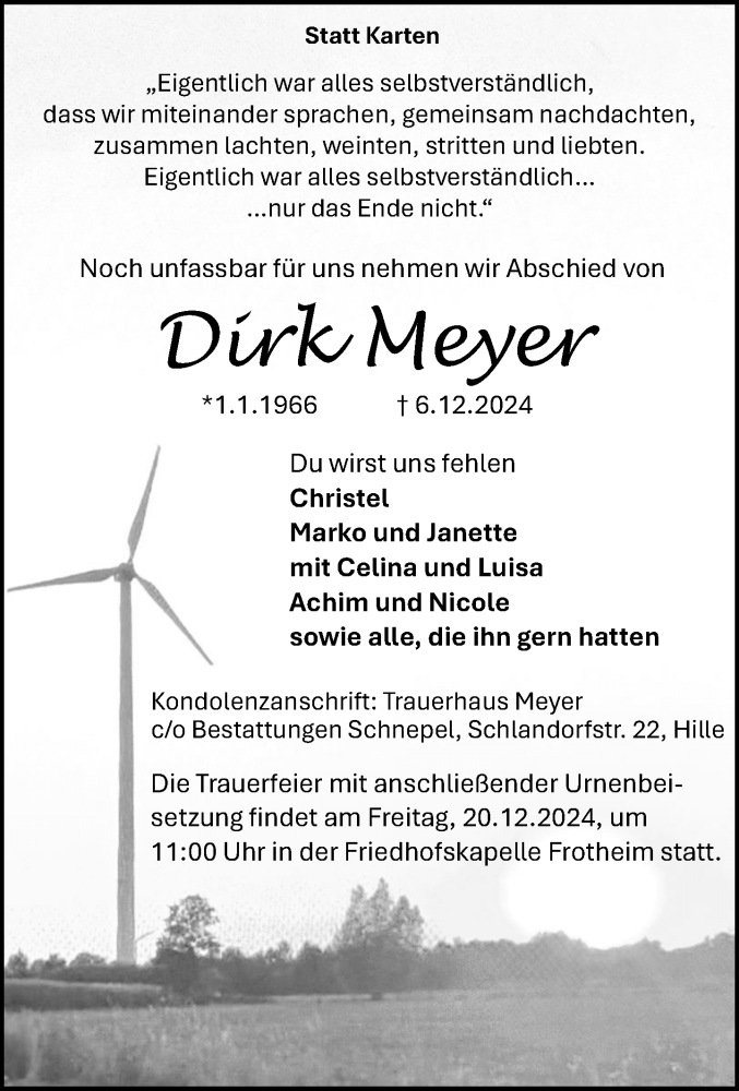 Hier finden Sie alle Traueranzeigen aus der Zeitung, die bisher für Dirk Meyer erschienen sind. Weitere Traueranzeigen, die in der Zeitung erscheinen, werden hier ebenfalls aufgelistet
