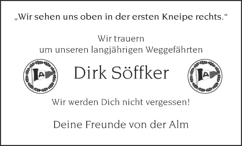Hier finden Sie alle Traueranzeigen aus der Zeitung, die bisher für Dirk Söffker erschienen sind. Weitere Traueranzeigen, die in der Zeitung erscheinen, werden hier ebenfalls aufgelistet