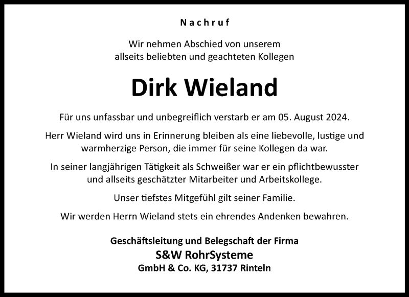 Hier finden Sie alle Traueranzeigen aus der Zeitung, die bisher für Dirk Wieland erschienen sind. Weitere Traueranzeigen, die in der Zeitung erscheinen, werden hier ebenfalls aufgelistet