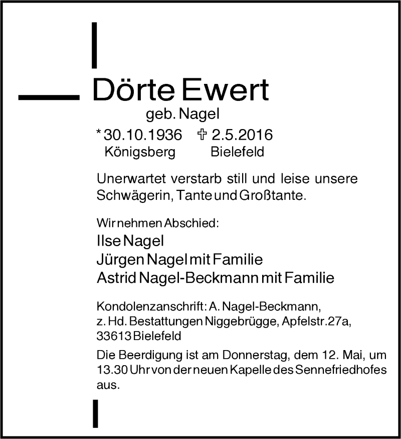 Hier finden Sie alle Traueranzeigen aus der Zeitung, die bisher für Dörte Ewert erschienen sind. Weitere Traueranzeigen, die in der Zeitung erscheinen, werden hier ebenfalls aufgelistet