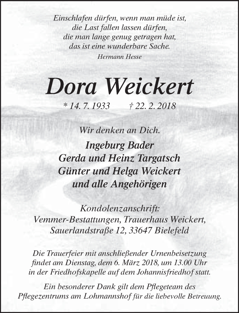 Hier finden Sie alle Traueranzeigen aus der Zeitung, die bisher für Dora Weickert erschienen sind. Weitere Traueranzeigen, die in der Zeitung erscheinen, werden hier ebenfalls aufgelistet