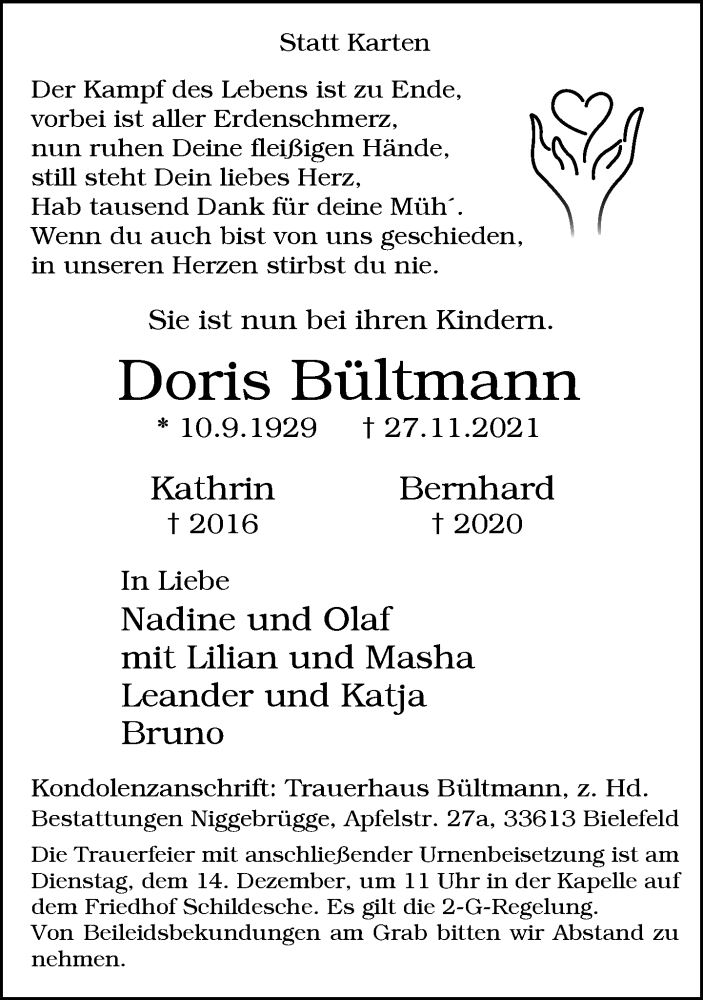 Hier finden Sie alle Traueranzeigen aus der Zeitung, die bisher für Doris Bültmann erschienen sind. Weitere Traueranzeigen, die in der Zeitung erscheinen, werden hier ebenfalls aufgelistet