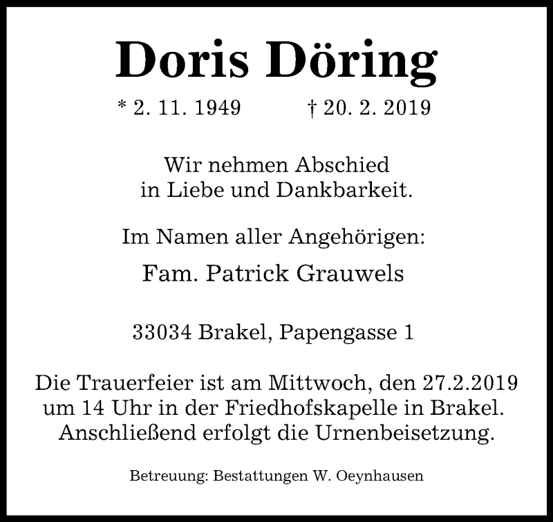 Hier finden Sie alle Traueranzeigen aus der Zeitung, die bisher für Doris Döring erschienen sind. Weitere Traueranzeigen, die in der Zeitung erscheinen, werden hier ebenfalls aufgelistet