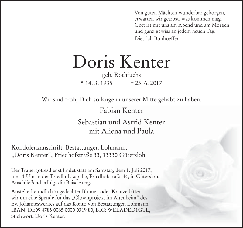Hier finden Sie alle Traueranzeigen aus der Zeitung, die bisher für Doris Kenter erschienen sind. Weitere Traueranzeigen, die in der Zeitung erscheinen, werden hier ebenfalls aufgelistet