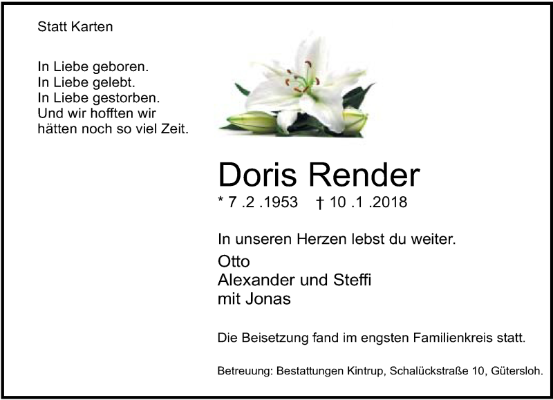 Hier finden Sie alle Traueranzeigen aus der Zeitung, die bisher für Doris Render erschienen sind. Weitere Traueranzeigen, die in der Zeitung erscheinen, werden hier ebenfalls aufgelistet