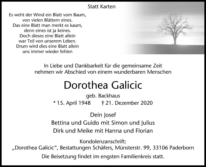 Hier finden Sie alle Traueranzeigen aus der Zeitung, die bisher für Dorothea Galicic erschienen sind. Weitere Traueranzeigen, die in der Zeitung erscheinen, werden hier ebenfalls aufgelistet
