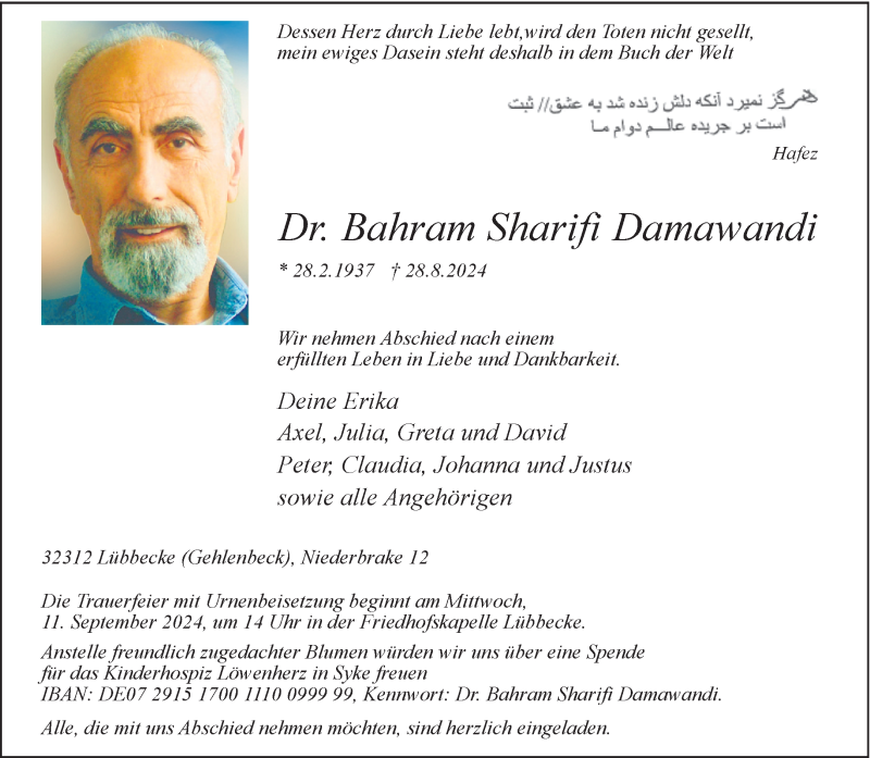 Hier finden Sie alle Traueranzeigen aus der Zeitung, die bisher für Dr. Bahram Sharifi Damawandi erschienen sind. Weitere Traueranzeigen, die in der Zeitung erscheinen, werden hier ebenfalls aufgelistet
