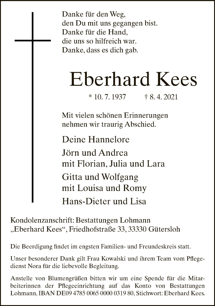 Hier finden Sie alle Traueranzeigen aus der Zeitung, die bisher für Eberhard Kees erschienen sind. Weitere Traueranzeigen, die in der Zeitung erscheinen, werden hier ebenfalls aufgelistet