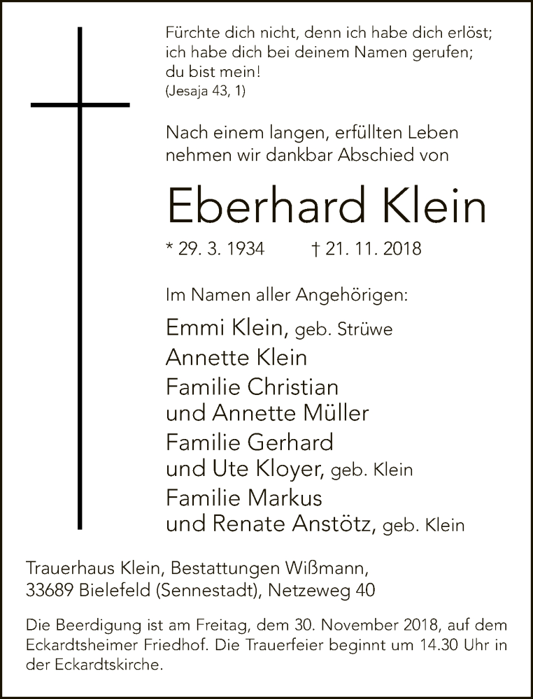 Hier finden Sie alle Traueranzeigen aus der Zeitung, die bisher für Eberhard Klein erschienen sind. Weitere Traueranzeigen, die in der Zeitung erscheinen, werden hier ebenfalls aufgelistet