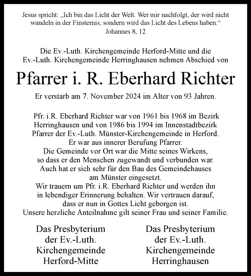 Hier finden Sie alle Traueranzeigen aus der Zeitung, die bisher für Eberhard Richter erschienen sind. Weitere Traueranzeigen, die in der Zeitung erscheinen, werden hier ebenfalls aufgelistet