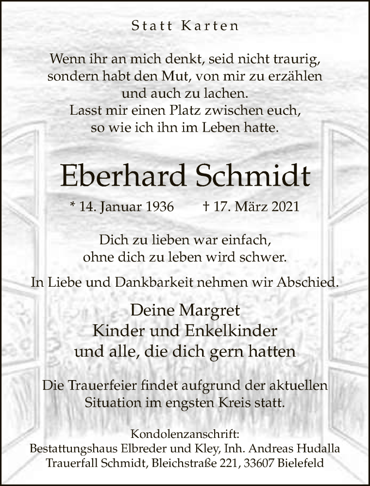 Hier finden Sie alle Traueranzeigen aus der Zeitung, die bisher für Eberhard Schmidt erschienen sind. Weitere Traueranzeigen, die in der Zeitung erscheinen, werden hier ebenfalls aufgelistet