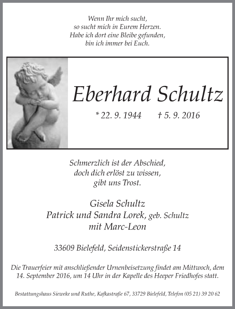 Hier finden Sie alle Traueranzeigen aus der Zeitung, die bisher für Eberhard Schultz erschienen sind. Weitere Traueranzeigen, die in der Zeitung erscheinen, werden hier ebenfalls aufgelistet