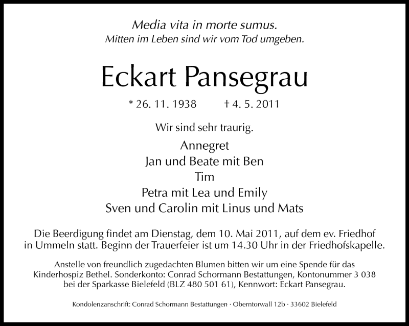 Hier finden Sie alle Traueranzeigen aus der Zeitung, die bisher für Eckart Pansegrau erschienen sind. Weitere Traueranzeigen, die in der Zeitung erscheinen, werden hier ebenfalls aufgelistet