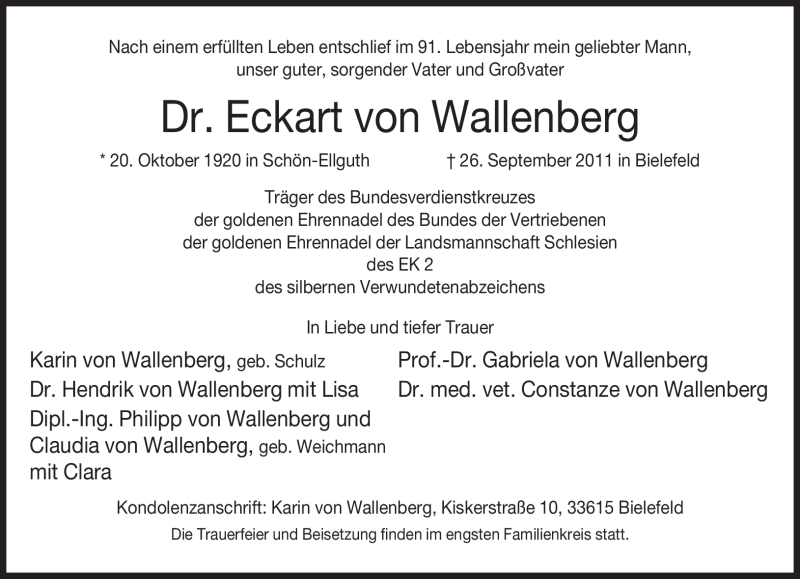Hier finden Sie alle Traueranzeigen aus der Zeitung, die bisher für Eckart von Wallenberg erschienen sind. Weitere Traueranzeigen, die in der Zeitung erscheinen, werden hier ebenfalls aufgelistet