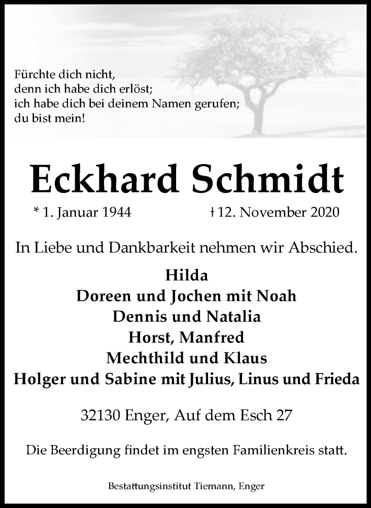 Hier finden Sie alle Traueranzeigen aus der Zeitung, die bisher für Eckhard Schmidt erschienen sind. Weitere Traueranzeigen, die in der Zeitung erscheinen, werden hier ebenfalls aufgelistet