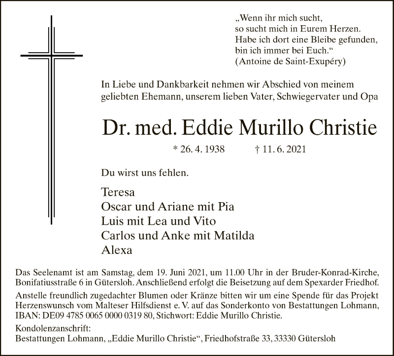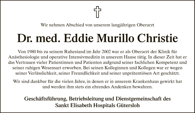 Hier finden Sie alle Traueranzeigen aus der Zeitung, die bisher für Eddie Murillo Christie erschienen sind. Weitere Traueranzeigen, die in der Zeitung erscheinen, werden hier ebenfalls aufgelistet