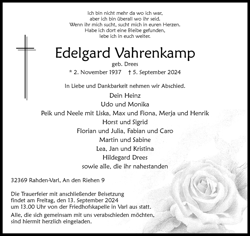 Hier finden Sie alle Traueranzeigen aus der Zeitung, die bisher für Edelgard Vahrenkamp erschienen sind. Weitere Traueranzeigen, die in der Zeitung erscheinen, werden hier ebenfalls aufgelistet