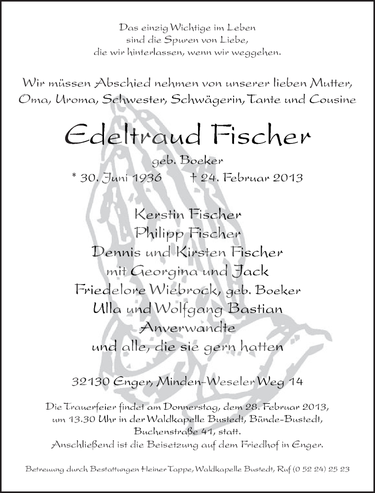 Hier finden Sie alle Traueranzeigen aus der Zeitung, die bisher für Edeltraud Fischer erschienen sind. Weitere Traueranzeigen, die in der Zeitung erscheinen, werden hier ebenfalls aufgelistet