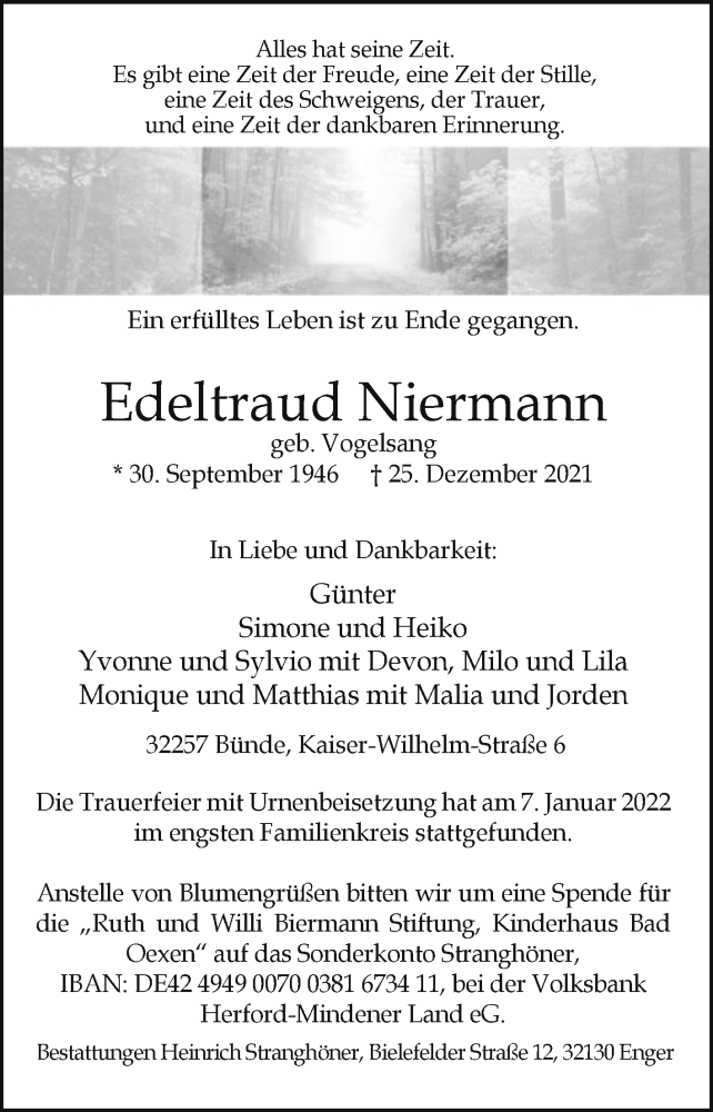Hier finden Sie alle Traueranzeigen aus der Zeitung, die bisher für Edeltraud Niermann erschienen sind. Weitere Traueranzeigen, die in der Zeitung erscheinen, werden hier ebenfalls aufgelistet