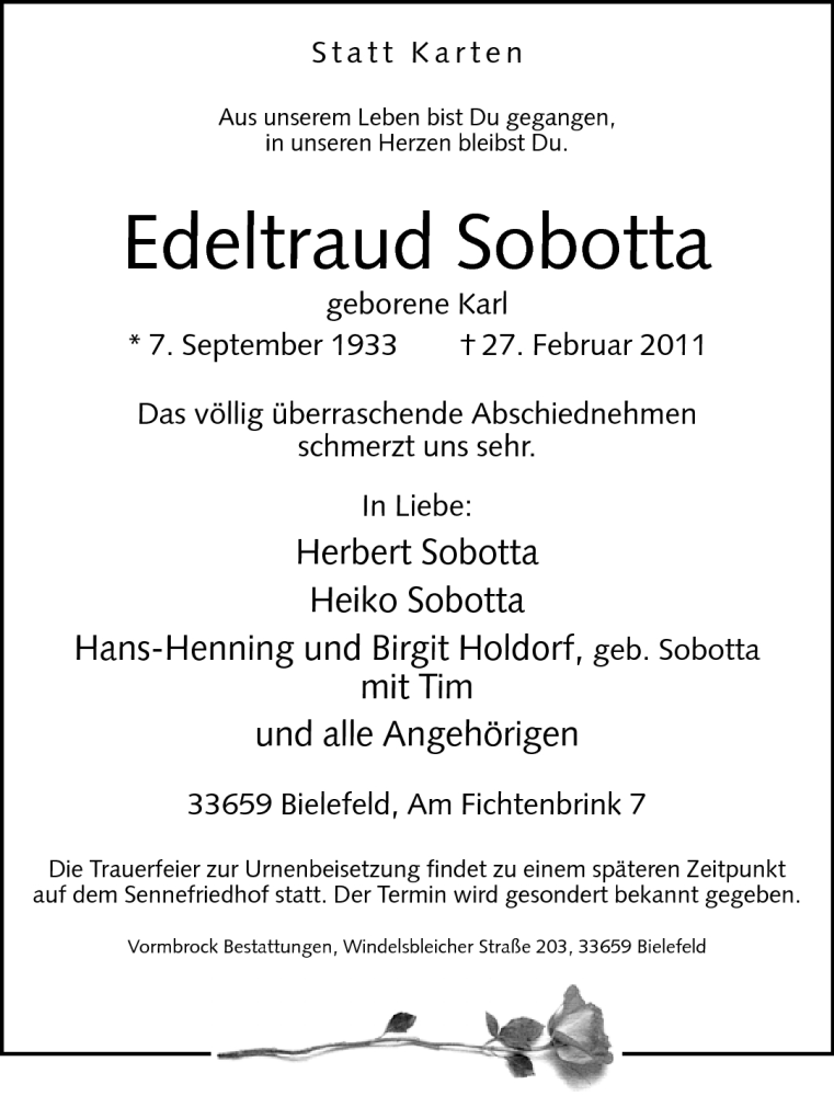 Hier finden Sie alle Traueranzeigen aus der Zeitung, die bisher für Edeltraud Sobotta erschienen sind. Weitere Traueranzeigen, die in der Zeitung erscheinen, werden hier ebenfalls aufgelistet