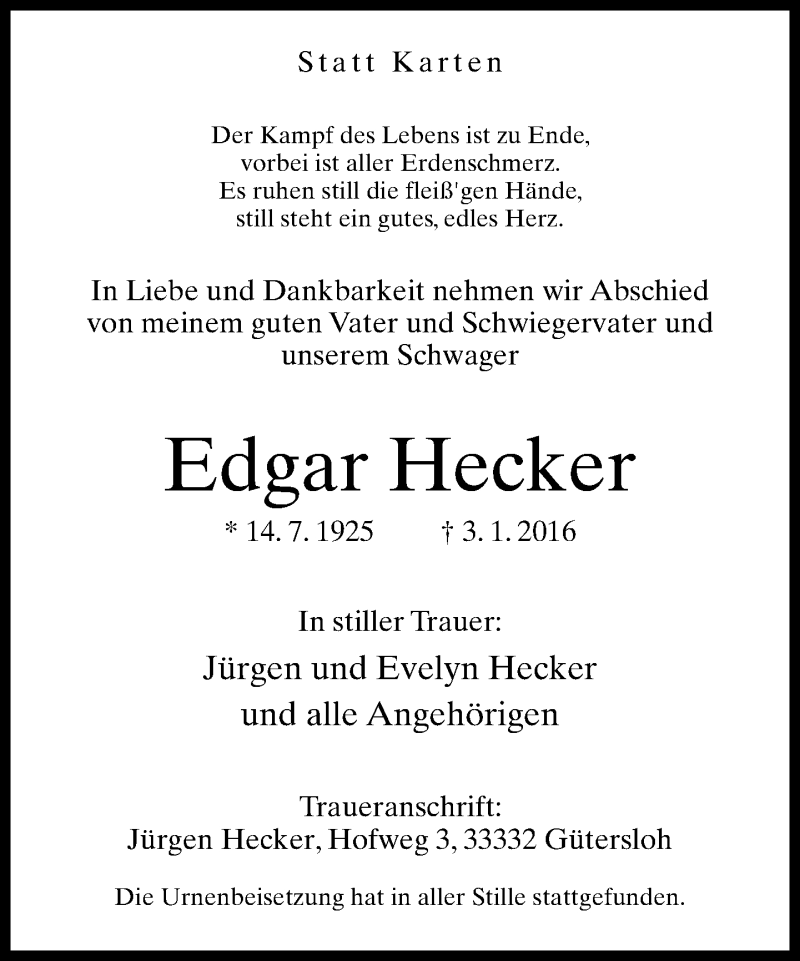 Hier finden Sie alle Traueranzeigen aus der Zeitung, die bisher für Edgar Hecker erschienen sind. Weitere Traueranzeigen, die in der Zeitung erscheinen, werden hier ebenfalls aufgelistet