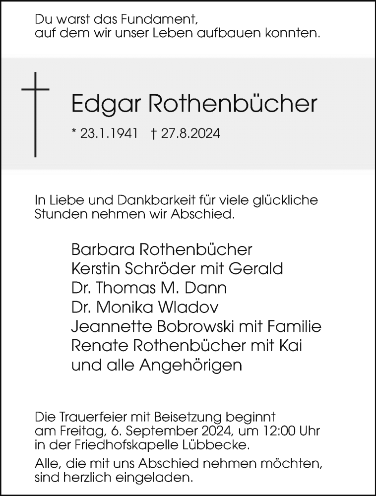 Hier finden Sie alle Traueranzeigen aus der Zeitung, die bisher für Edgar Rothenbücher erschienen sind. Weitere Traueranzeigen, die in der Zeitung erscheinen, werden hier ebenfalls aufgelistet