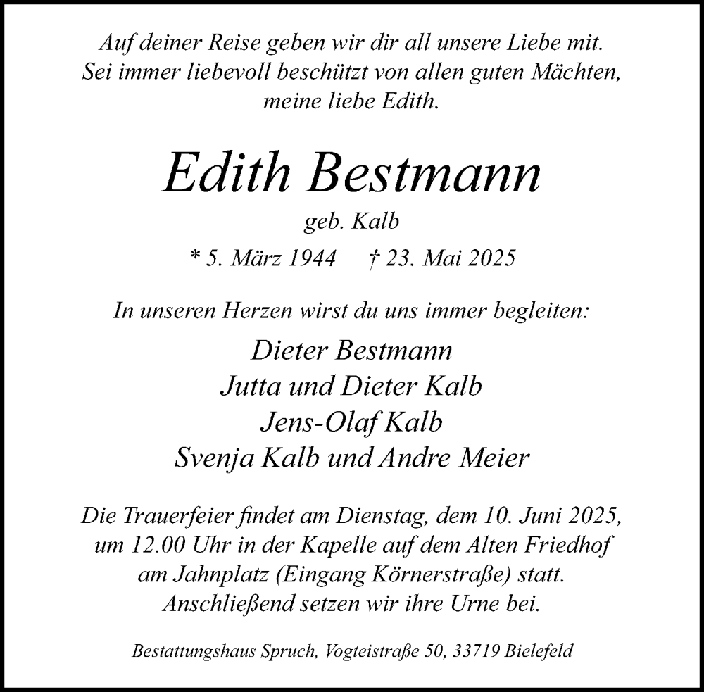 Hier finden Sie alle Traueranzeigen aus der Zeitung, die bisher für Edith Bestmann erschienen sind. Weitere Traueranzeigen, die in der Zeitung erscheinen, werden hier ebenfalls aufgelistet