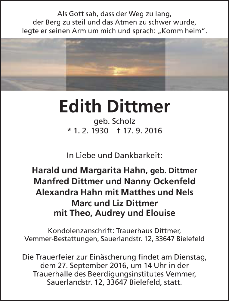 Hier finden Sie alle Traueranzeigen aus der Zeitung, die bisher für Edith Dittmer erschienen sind. Weitere Traueranzeigen, die in der Zeitung erscheinen, werden hier ebenfalls aufgelistet