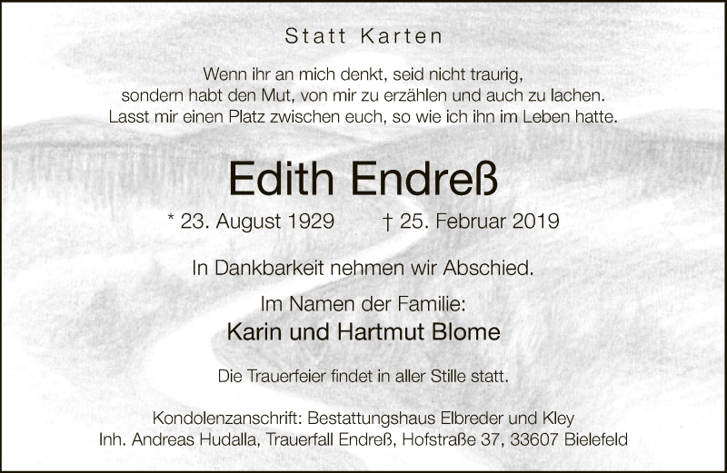 Hier finden Sie alle Traueranzeigen aus der Zeitung, die bisher für Edith Endreß erschienen sind. Weitere Traueranzeigen, die in der Zeitung erscheinen, werden hier ebenfalls aufgelistet