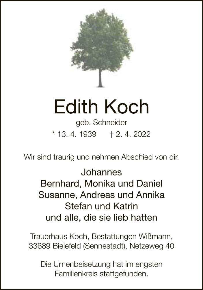 Hier finden Sie alle Traueranzeigen aus der Zeitung, die bisher für Edith Koch erschienen sind. Weitere Traueranzeigen, die in der Zeitung erscheinen, werden hier ebenfalls aufgelistet