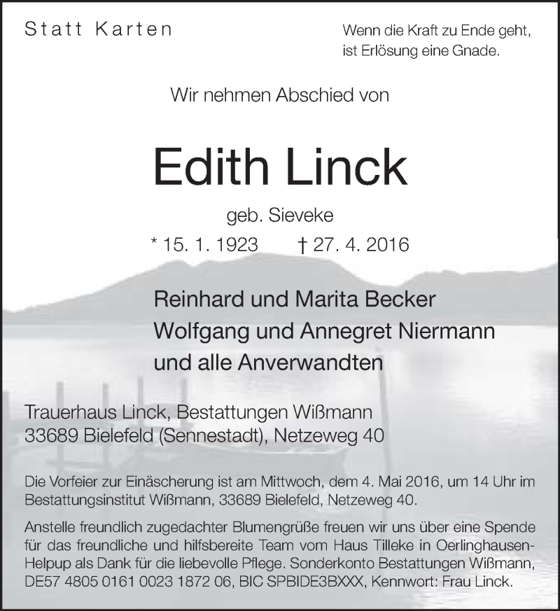 Hier finden Sie alle Traueranzeigen aus der Zeitung, die bisher für Edith Linck erschienen sind. Weitere Traueranzeigen, die in der Zeitung erscheinen, werden hier ebenfalls aufgelistet