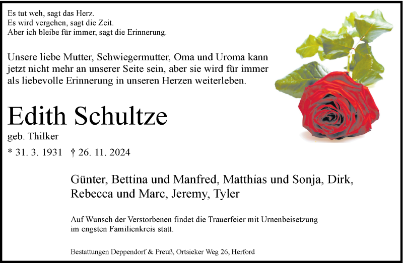 Hier finden Sie alle Traueranzeigen aus der Zeitung, die bisher für Edith Schultze erschienen sind. Weitere Traueranzeigen, die in der Zeitung erscheinen, werden hier ebenfalls aufgelistet