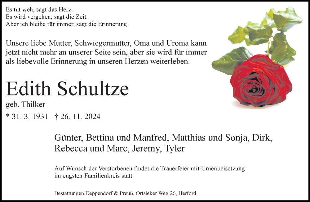 Hier finden Sie alle Traueranzeigen aus der Zeitung, die bisher für Edith Schultze erschienen sind. Weitere Traueranzeigen, die in der Zeitung erscheinen, werden hier ebenfalls aufgelistet