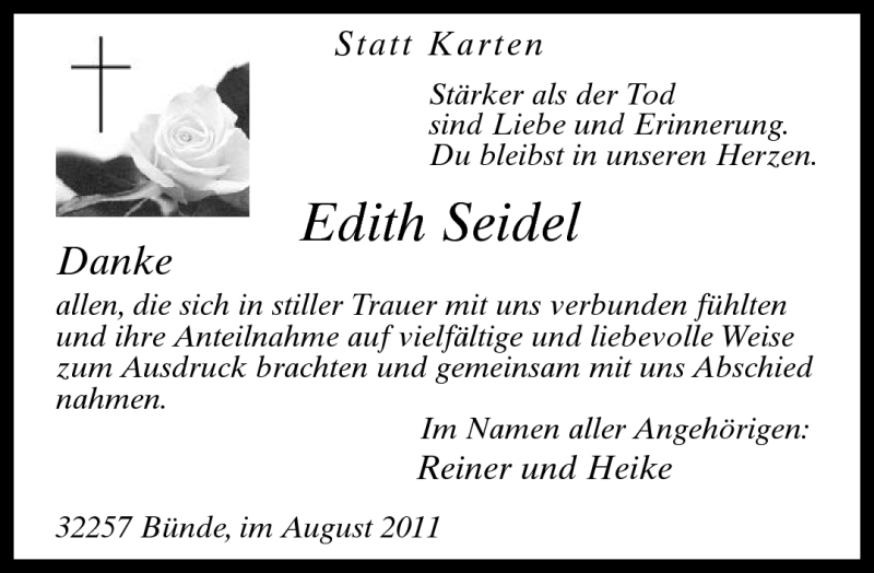 Hier finden Sie alle Traueranzeigen aus der Zeitung, die bisher für Edith Seidel erschienen sind. Weitere Traueranzeigen, die in der Zeitung erscheinen, werden hier ebenfalls aufgelistet