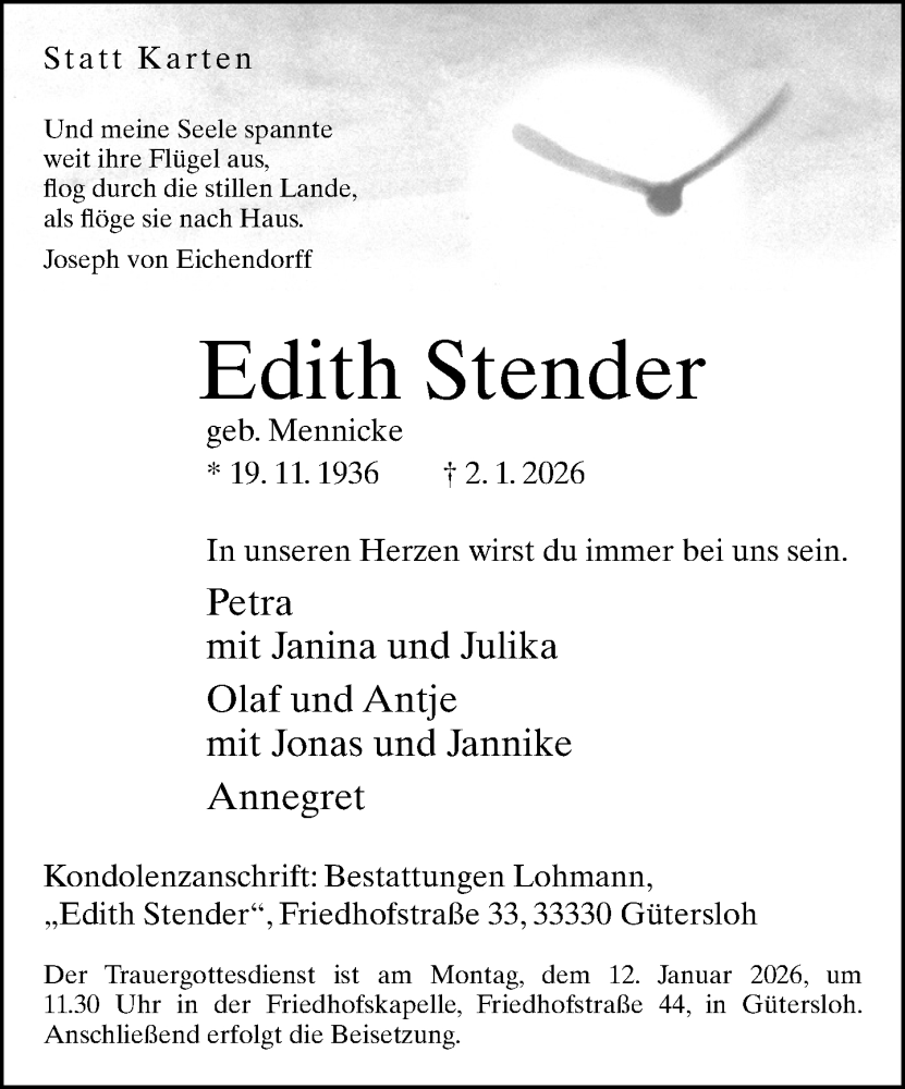 Hier finden Sie alle Traueranzeigen aus der Zeitung, die bisher für Edith Stender erschienen sind. Weitere Traueranzeigen, die in der Zeitung erscheinen, werden hier ebenfalls aufgelistet