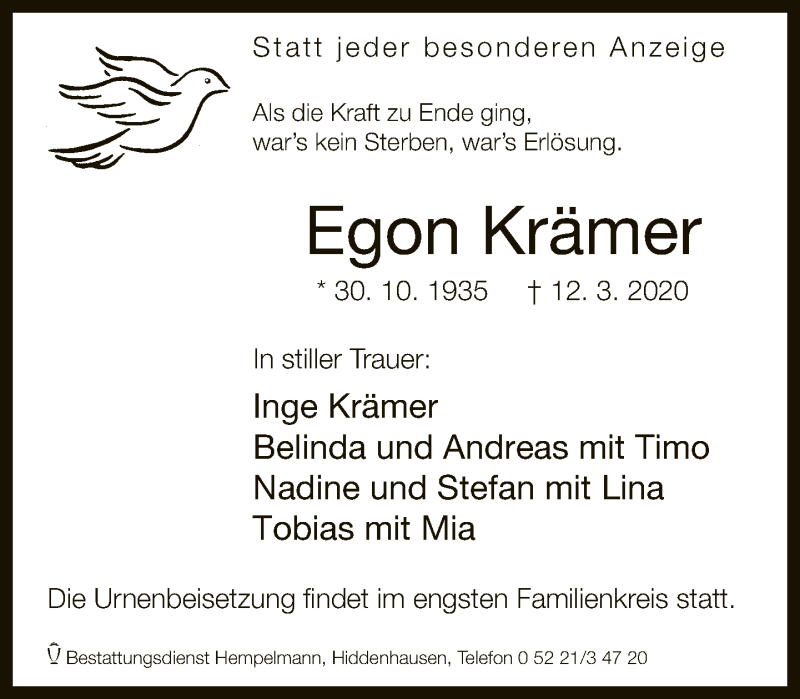 Hier finden Sie alle Traueranzeigen aus der Zeitung, die bisher für Egon Krämer erschienen sind. Weitere Traueranzeigen, die in der Zeitung erscheinen, werden hier ebenfalls aufgelistet